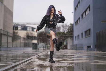 A young woman playing with the water in the street after the rain