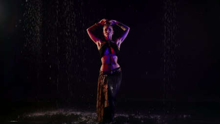 eastern dance of young woman standing under rain in darkness, arabic or indian belly dance performance