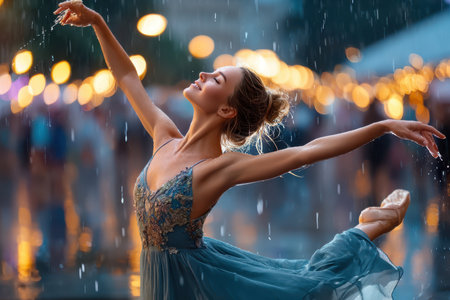 A dancer spins elegantly in the rain, showcasing ballet movements under glowing lights at dusk.