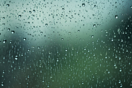 Raindrops on a glass window with a blurred background, capturing a tranquil and soothing mood.