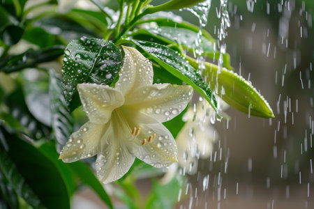 White lily flower with water drops on petals and green leaves