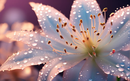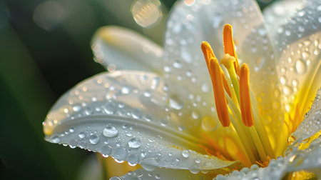 Captivating close up shot of a delicate lily flower with intricate petals and glistening water droplets softly illuminated by the warm morning sunlight showcasing the beauty and elegance of nature