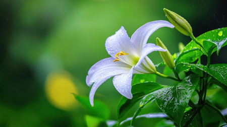 Beautiful white lily flower with rain drops on green leaves background