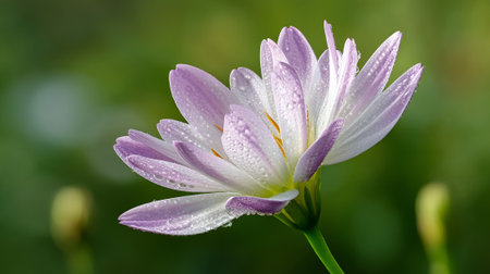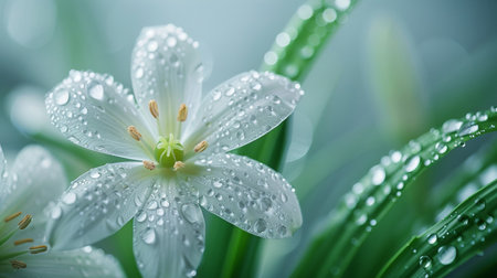 Close-up of a delicate flower with glistening water droplets on its petals, capturing the intricate details and fresh, dewy appearance.