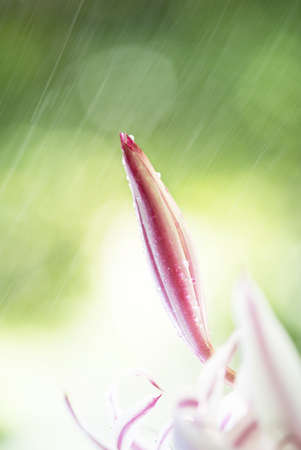 White and red lily flower with rain drops in the garden.