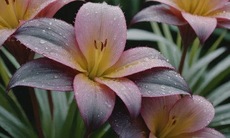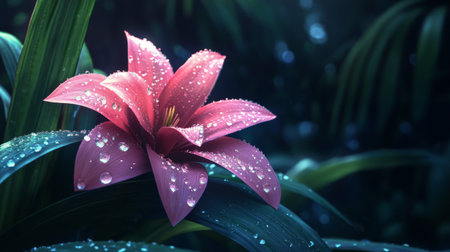 A delicate lily with droplets of water on its petals, reflecting light and color, surrounded by lush green leaves, creating a beautiful nature composition