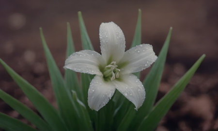 White lily with rain drops on its petals and green leaves