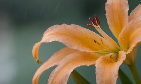 Orange lily with rain drops on the petals and green background