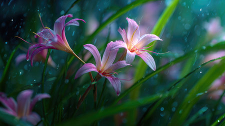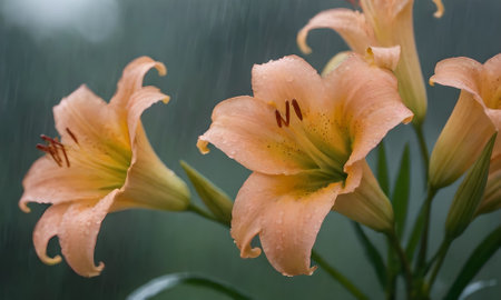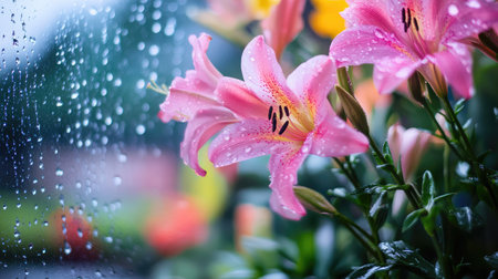 A close-up view of pink lily blooms glistening with raindrops against a blurred garden backdrop. Perfect for nature-themed designs and tranquil settings.
