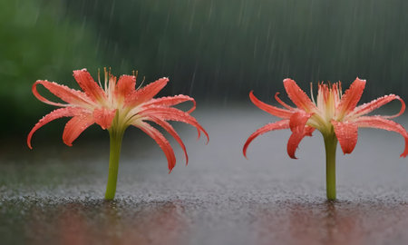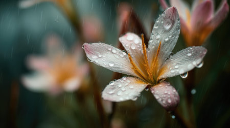 Soft rain falling gently on Rain lily, with water droplets forming and slowly dripping. The background is softly blurred with a natural, moody atmosphere.