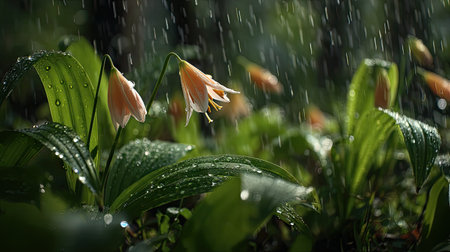 Rain lily in gentle light rain, soft raindrops visible on vivid green leaves, natural realistic style, bright fresh colors, balanced wide composition, cinematic framing, highly detailed.