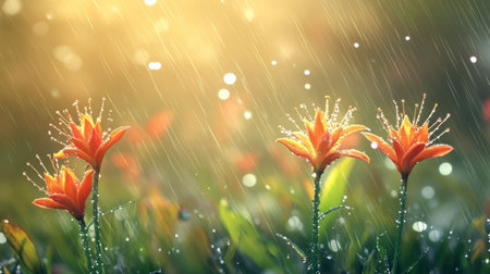 Stunning orange flowers adorned with raindrops bask in soft morning light. This vibrant nature scene captures beauty, freshness, and tranquility in a garden setting.