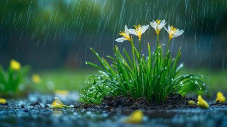 A beautiful scene of delicate white flowers blooming in the garden, surrounded by rainwater droplets. The vivid colors and serene atmosphere showcase nature's beauty during spring.