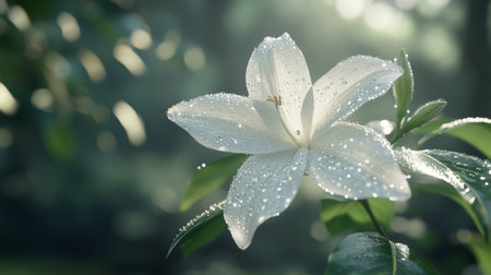 A stunning close-up of a delicate white lily adorned with dew drops in soft morning light, showcasing nature's elegance and tranquility in a serene garden setting.