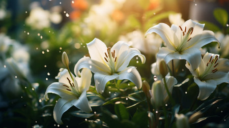 Stunning close-up of white lilies adorned with water droplets, captured in soft light. This image radiates natural beauty and elegance, ideal for floral themes.