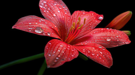 AI Generated. A macro shot of a red flower with water droplets on its petals and in its center