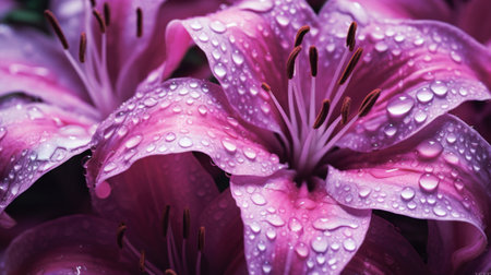Beautiful pink lily flowers with raindrops on the petals
