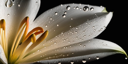 Raindrops on a white lily flower petal in close up macro photography