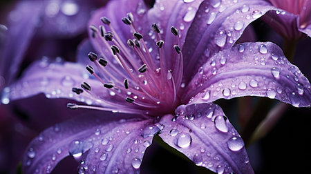 Purple lilies with dew drops on petals close up