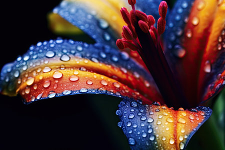 A dramatic close-up of a tropical flower with vivid colors, showcasing water droplets that enhance its beauty, set against a contrasting dark background