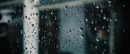 This image presents a close-up view of raindrops falling onto a surface. The composition highlights the water droplets, creating a sense of movement and texture. The cool color palette and blurred background suggest a wet environment. Suitable for editorial purposes.