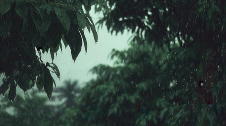 Heavy Rain in Tropical Jungle, Lush Green Foliage Wet from Monsoon Downpour, Nature Background
