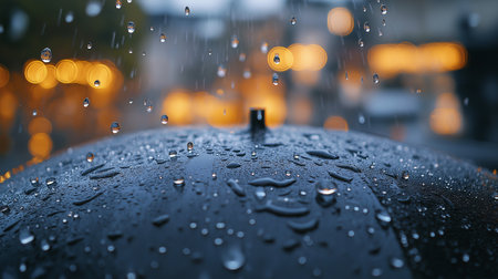 This image presents a close-up view of raindrops falling onto a surface. The composition highlights the water droplets, creating a sense of movement and texture. The cool color palette and blurred background suggest a wet environment. Suitable for editorial purposes.