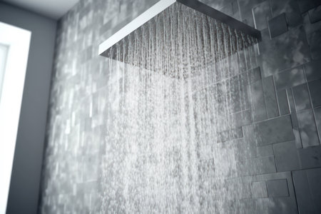 Closeup of a shower with running water. Composite with different elements made with generative AI
