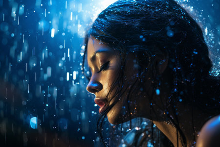Close-up of a contemplative woman with water droplets and moody backlighting