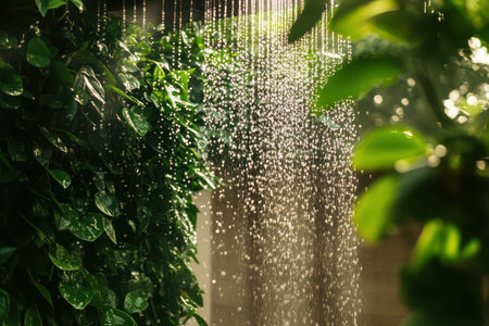 Water cascades from an outdoor shower surrounded by green foliage, symbolizing eco-living, relaxation, and natural hydration.