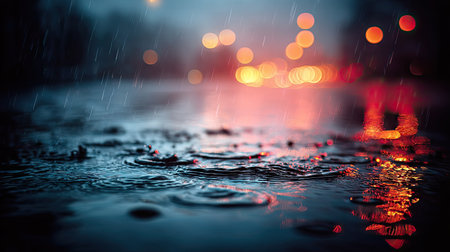 Raindrops falling on a water surface, glowing light spots in the background, a dark background, a bokeh effect, orange and yellow lights, a blurred background, water reflection, a dark sky, raindrops, a rain scene, blurred motion of rain droplets, rain in the air, a rain effect, a blurred background. --chaos 20 --ar 16:9 --stylize 750 --v 7 Job ID: 220cffb9-e8b0-45cd-9d83-e50537255db3