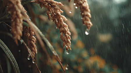 Soft rain falling gently on Plantain, with water droplets forming and slowly dripping. The background is softly blurred with a natural, moody atmosphere.