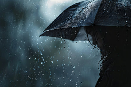 Rain, woman and umbrella for protection from water drops. Ai generated person with cover from storm