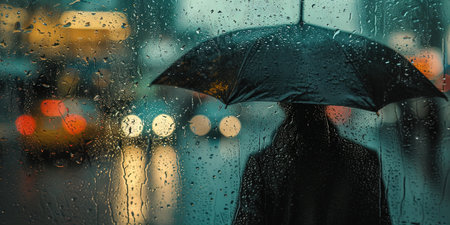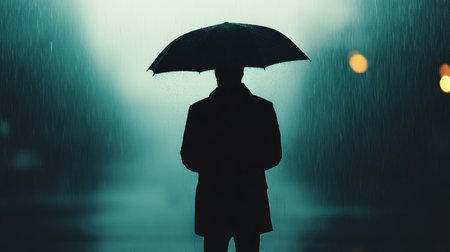 Heavy rain falls in a city as a person stands still under an umbrella. The silhouette contrasts against the glowing lights, creating a moody and atmospheric nighttime setting.