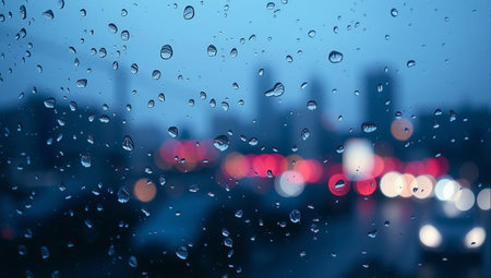 Close-up capture of rain drops on a glass window, showcasing a colorful background with a soft bokeh effect, enhancing the mood of tranquility and beauty.