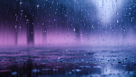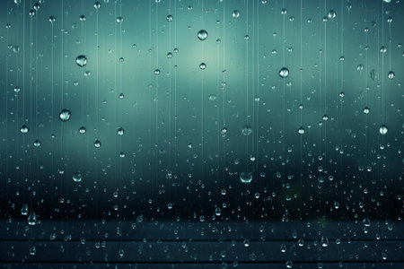 This image presents a close-up view of raindrops falling onto a surface. The composition highlights the water droplets, creating a sense of movement and texture. The cool color palette and blurred background suggest a wet environment. Suitable for editorial purposes.