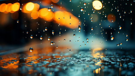 Rain drops falling on wet asphalt with blurred background and bokeh