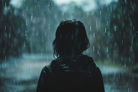 A solitary figure faces away, drenched in rain, as droplets cascade around them in a tranquil forest setting on a dreary day.