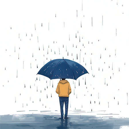 Someone walks alone in the rain, head down, shoulders hunched, holding an umbrella. Somber, lonely scene with falling raindrops and gray sky.