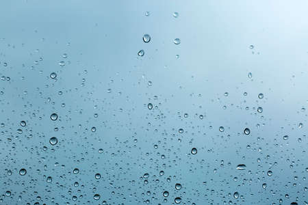 Raindrops on window. Wet glass blue tone background. Fresh water droplets.