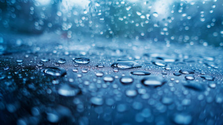 This image presents a close-up view of raindrops falling onto a surface. The composition highlights the water droplets, creating a sense of movement and texture. The cool color palette and blurred background suggest a wet environment. Suitable for editorial purposes.