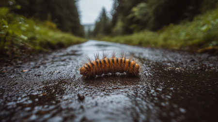A detailed close-up of a fuzzy caterpillar crawling across a rain-soaked forest path, highlighting the beauty and richness of natural wildlife in a tranquil setting.