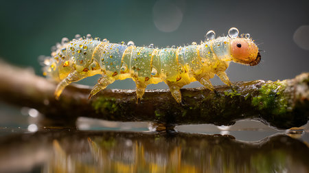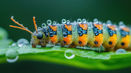 A captivating close-up view of a unique caterpillar resting on a vibrant green leaf, adorned with glistening dew. The image captures the intricate details of this insect in its natural habitat, showcasing the lush, tranquil environment and the beauty of nature. Perfect for illustrating themes of growth and exploration in the natural world.