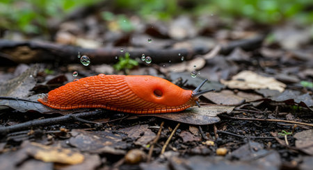 A vibrant orange-red slug crawls slowly across dark, decaying leaves on a forest floor. Suspended water droplets in the air suggest a rainy atmosphere, highlighting the damp habitat of this gastropod.