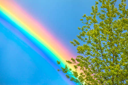 Detail of tree and rainbow at spring on blue sky background (copy space)
