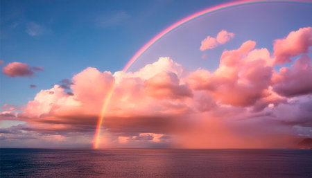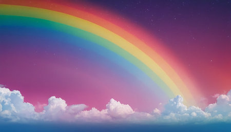 A stunning rainbow stretches perfectly across a serene sky, framed by soft clouds, showcasing vibrant colors and evoking feelings of peace and wonder.