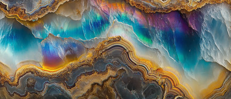 Macro shot of a vivid multicolored gemstone slice with iridescent crystal patterns and rough gold-edged borders. Abstract natural mineral texture.
