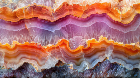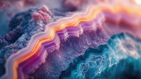 This high-resolution image showcases a close-up of abstract agate stone, featuring stunning layers of pink, purple, blue, and orange Its unique, elegant design, inspired by geology, creates a decorative surface with earthy tones The calm, vibrant colors and serene gemstone style offer a captivating, relaxing visual, perfect for backgrounds or AI Generative