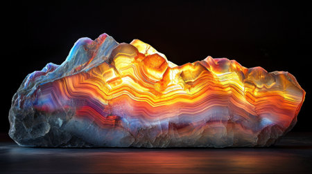 This stunning agate rock features vivid colors and detailed patterns that highlight its natural beauty, illuminated against a contrasting dark background.