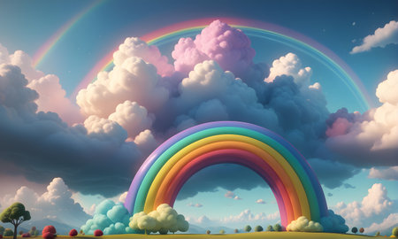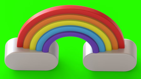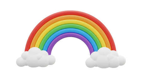 3D Rendering concept of rainbow: rainbow over two white clouds on blue sky background. 3D render. 3D illustration.